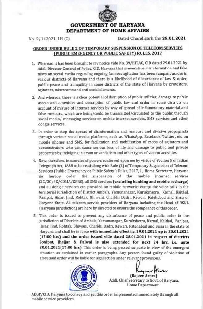 बड़ी ख़बर आ रही है हरियाणा सरकार ने तुरंत प्रभाव से अंबाला, यमुनानगर, कुरुक्षेत्र, करनाल, कैथल, पानीपत, हिसार, जींद, रोहतक, भिवानी, चरखी दादरी, फतेहाबाद, रेवाड़ी और सिरसा जिलों में वॉयस कॉल को छोड़कर इंटरनेट सेवाओं को 30 जनवरी, 2021 शाम 5 बजे तक के लिए बंद करने का निर्णय लिया है,